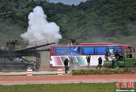 作為亞運安保主力的武警廣東總隊官兵,連日來在某訓練基地進行演練。為應(yīng)對恐怖事件,該總隊強化了體能、攀登、擒敵、射擊、偵查、野外生存等訓練,并邀請反恐專家研究處置策略和戰(zhàn)術(shù)手段。
